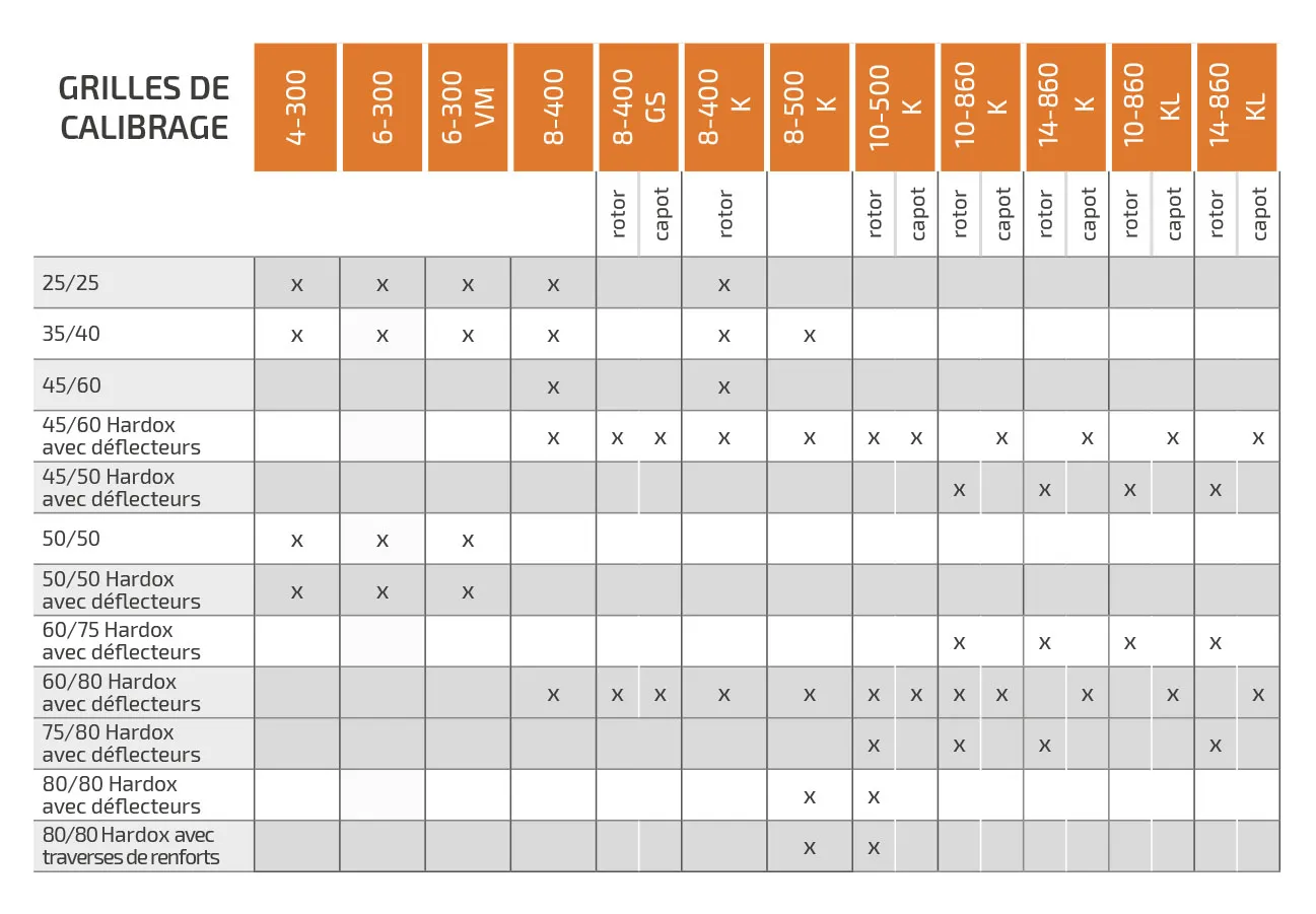 Le changement facile de la grille de calibrage offre un large choix de granulométrie.