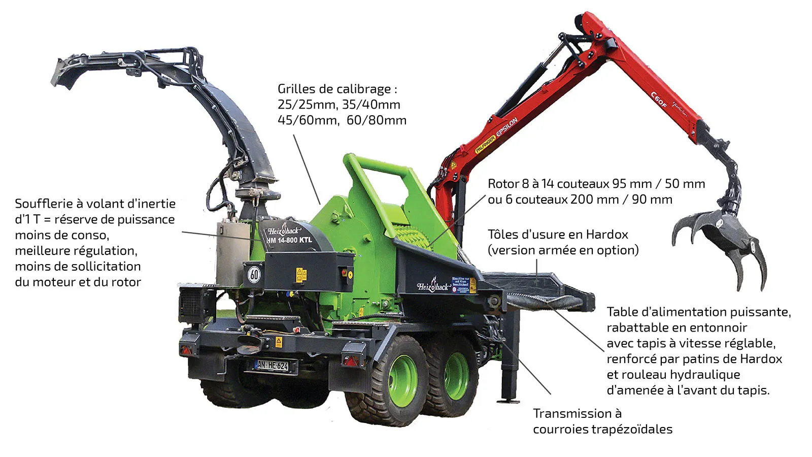 La conception globale des déchiqueteuses à plaquettes HEIZOHACK est optimisée et renforcée pour garantir efficacité de broyage et haute qualité de plaquette.