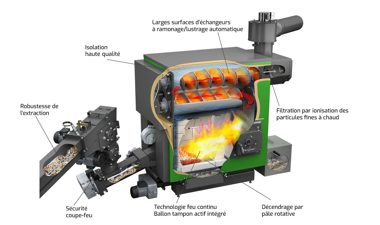 L’ensemble de la conception de la chaudière est basée sur les contraintes spécifiques liées à la plaquette : architecture horizontale, robustesse du système d’extraction, écluse rotative, fonctionnement en feu continu, ballon tampon actif intégré, échangeurs thermiques avec turbulateurs ramoneurs rotatifs intégrés.